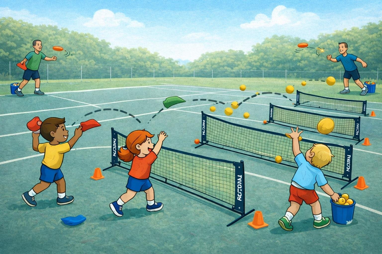 • Set up multiple mini tennis nets in straight rows, creating a series of “fences”