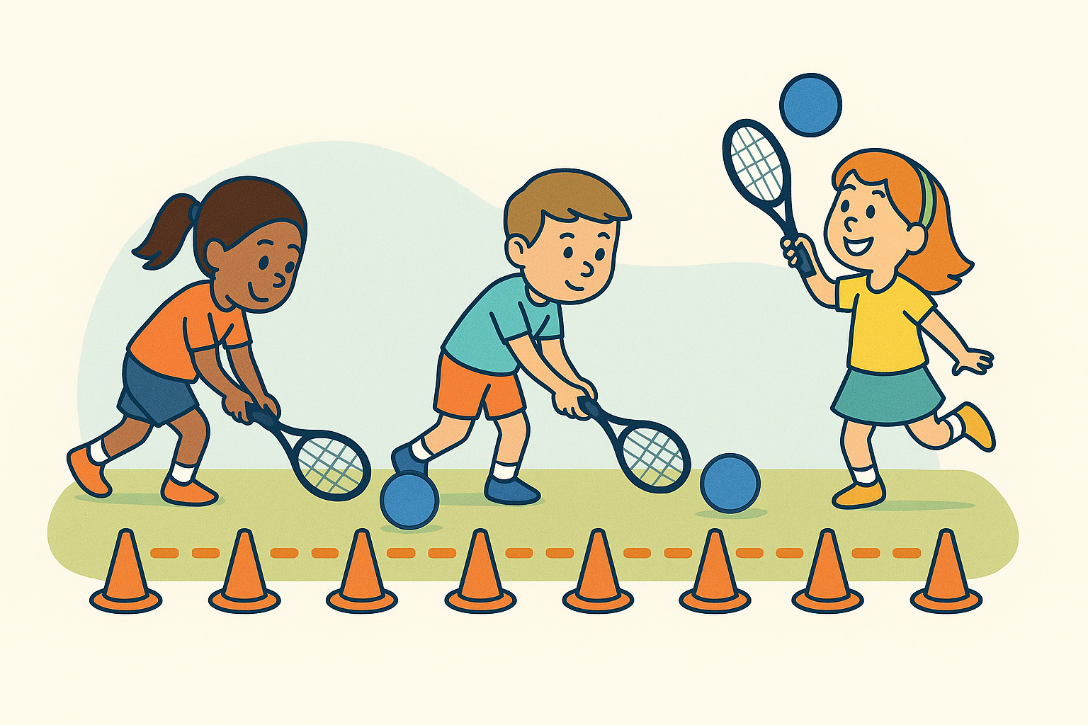 Tap it like hockey, keep it under control, and when you get to the cones, lift it over the wall using your racket. Then run back and try again!”