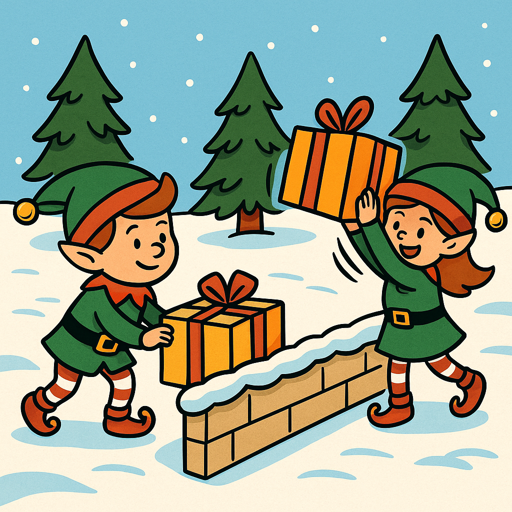 The children are Elves, and the balls become presents they must push through the snowy forest and lift over the fence into Santa’s Delivery Zone.